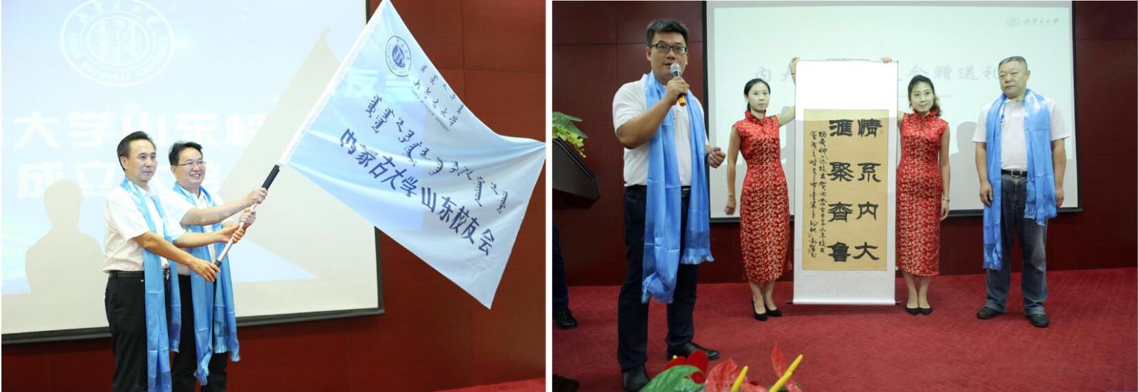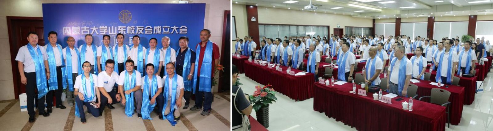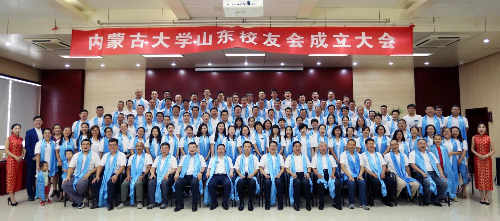 上午10點(diǎn),大會(huì)在內(nèi)蒙古大學(xué)校歌中正式拉開帷幕。校友們集體觀看內(nèi)蒙古大學(xué)紀(jì)錄片;內(nèi)大90級(jí)歷史系校友、內(nèi)大山東校友會(huì)籌委會(huì)主任鄧剛作籌備工作報(bào)告;大會(huì)表決通過了內(nèi)蒙古大學(xué)山東校友會(huì)章程;公布了內(nèi)大山東校友會(huì)首屆理事會(huì)名單和校友會(huì)首任會(huì)長(zhǎng)、副會(huì)長(zhǎng)、秘書長(zhǎng)、副秘書長(zhǎng)的名單;內(nèi)大副校長(zhǎng)、內(nèi)大校友總會(huì)會(huì)長(zhǎng)鐵勇為山東校友會(huì)授旗,林擘會(huì)長(zhǎng)代表內(nèi)大山東校友會(huì)接受會(huì)旗;內(nèi)大呼和浩特校友會(huì)會(huì)長(zhǎng)、內(nèi)大文學(xué)與新聞傳播學(xué)院原黨總支書記王俊川代表兄弟校友會(huì)致辭;煙威校友會(huì)向山東校友會(huì)送上“情系內(nèi)大、匯聚齊魯”的書法作品;96級(jí)文史哲基地班校友王莉代表山東校友發(fā)言;內(nèi)大山東校友會(huì)首任會(huì)長(zhǎng)林擘致辭,并帶領(lǐng)全體到會(huì)校友領(lǐng)讀內(nèi)蒙古大學(xué)山東校友會(huì)成立宣言;內(nèi)蒙古大學(xué)副校長(zhǎng)、內(nèi)蒙古大學(xué)校友總會(huì)會(huì)長(zhǎng)鐵勇代表學(xué)校發(fā)表重要講話,對(duì)山東校友會(huì)提出殷切希望。最后,鐵勇副校長(zhǎng)等校領(lǐng)導(dǎo)、嘉賓和與會(huì)所有人員進(jìn)行了集體合影,內(nèi)蒙古大學(xué)山東校友會(huì)成立大會(huì)在一片溫馨和諧的氣氛中結(jié)束。