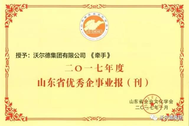 會上,沃爾德集團內刊《牽手》被評為“2017年度山東省優秀企事業報刊”。自2011年7月16日創刊以來,已出版60期。此次獲得該榮譽,是對集團內刊《牽手》及企業文化建設的莫大認可和肯定。