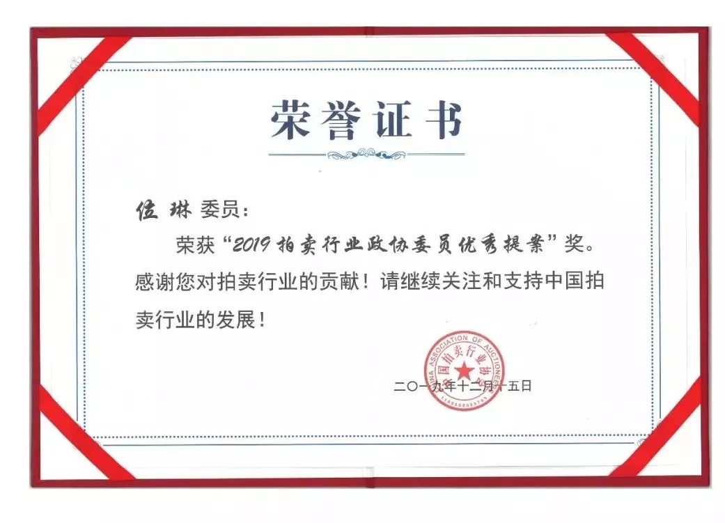 總經理位琳榮獲“2019年拍賣行業(yè)政協(xié)委員優(yōu)秀提案”獎