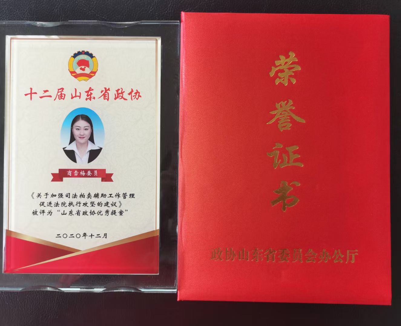 會議表彰了十二屆省政協以來的優秀提案、先進提案承辦單位和先進提案工作者。山東省政協委員、山東省新的社會階層人士聯誼會副會長、金諾國拍集團董事長商雪梅撰寫的《關于加強司法拍賣輔助工作管理促進法院執行攻堅的建議》被評為“山東省政協優秀提案”,并在大會上作為唯一一位優秀提案代表進行了題為《情系建言路 廖力著文章》的匯報發言。