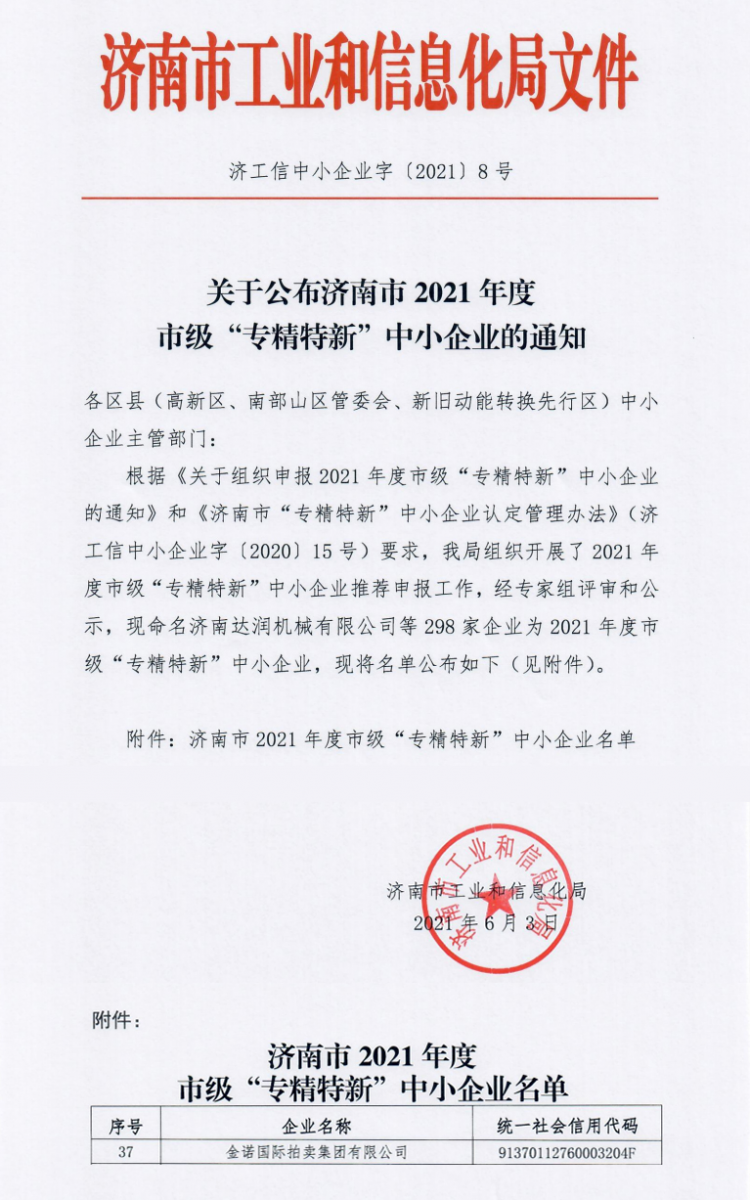 根據(jù)《關于組織申報2021年度市級“專精特新”中小企業(yè)的通知》和《濟南市“專精特新”中小企業(yè)認定管理辦法》要求,我公司經(jīng)過企業(yè)信用評價、資料審核、評定指標統(tǒng)計分析等多個環(huán)節(jié)審核,近日,濟南市工業(yè)和信息化局正式公布了2021年“專精特新”中小企業(yè)名單,金諾國際拍賣集團有限公司憑借在企業(yè)創(chuàng)新發(fā)展方面的突出成就順利入選,被評為2021年度濟南市“專精特新”企業(yè)。