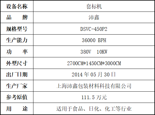 標的四:套標機,起拍價:30萬元(不含稅),標的設有保留價,競買保證金6萬元。已拆機,設備完好。