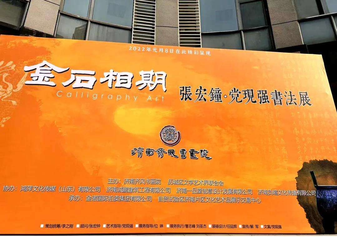2022年1月8日上午,由濟南市歷城區文學藝術界聯合會、濟南齊風書畫院共同主辦,金諾國拍集團與自貿試驗區濟南片區文化藝術品展示交易中心承辦的“金石相期——張宏鐘、黨現強書法展”在自貿試驗區濟南片區文化藝術品展示交易中心拉開帷幕。