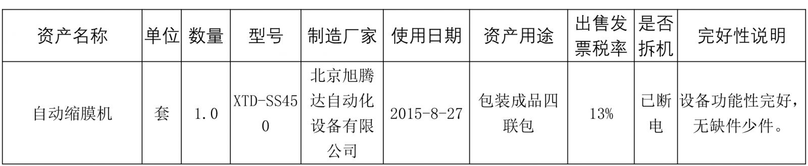 標(biāo)的二:自動(dòng)縮膜機(jī)設(shè)備一批(具體見附件),標(biāo)的設(shè)有保留價(jià),標(biāo)的保證金為2萬元,起拍價(jià)5萬元(含稅,稅率見詳情表) ;