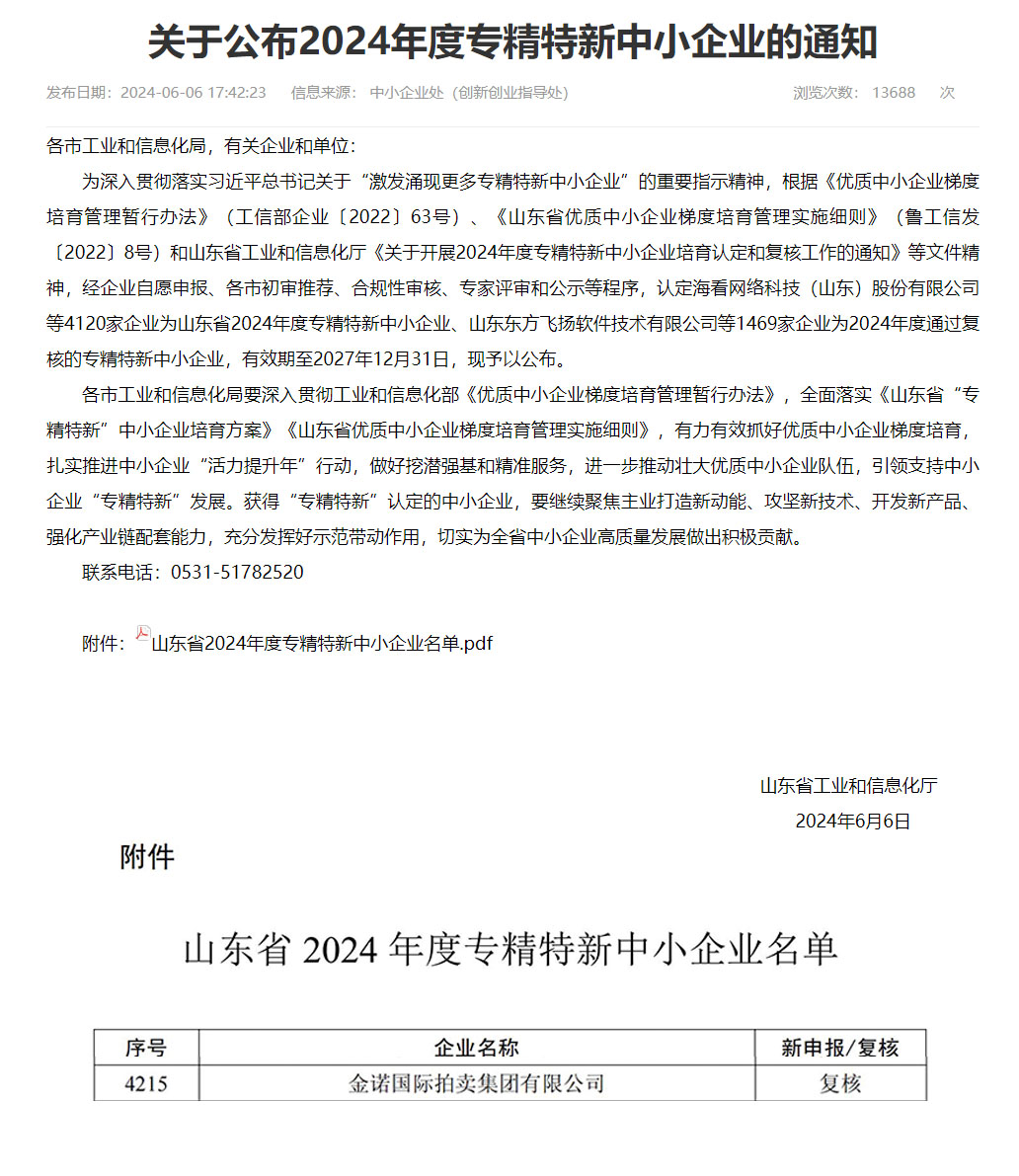 近日,山東省工業(yè)和信息化廳公布了“山東省2024年度專精特新中小企業(yè)名單”,金諾國際拍賣集團(tuán)有限公司順利通過初審?fù)扑]、合規(guī)性審查和專家評審等程序,蟬聯(lián)山東省“專精特新”中小企業(yè)榮譽(yù)稱號(hào)。
