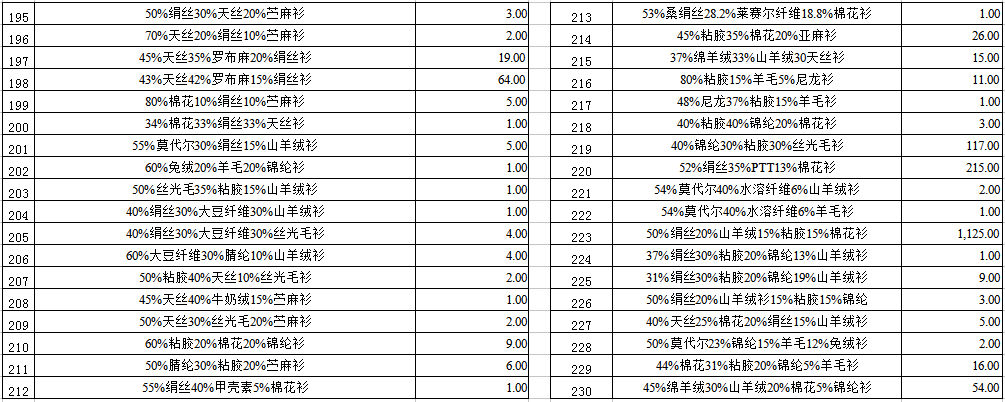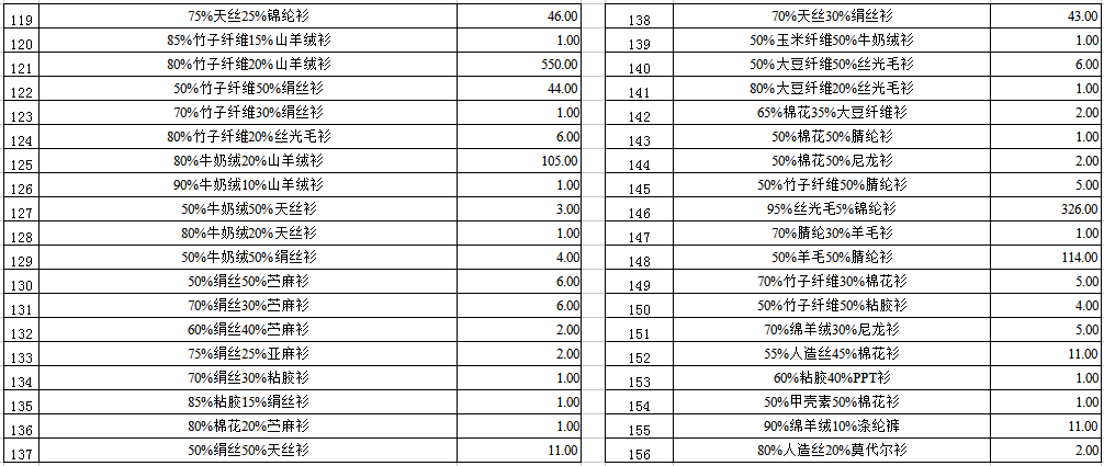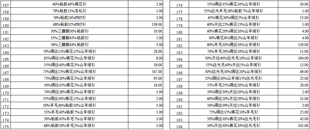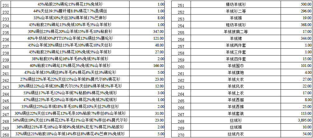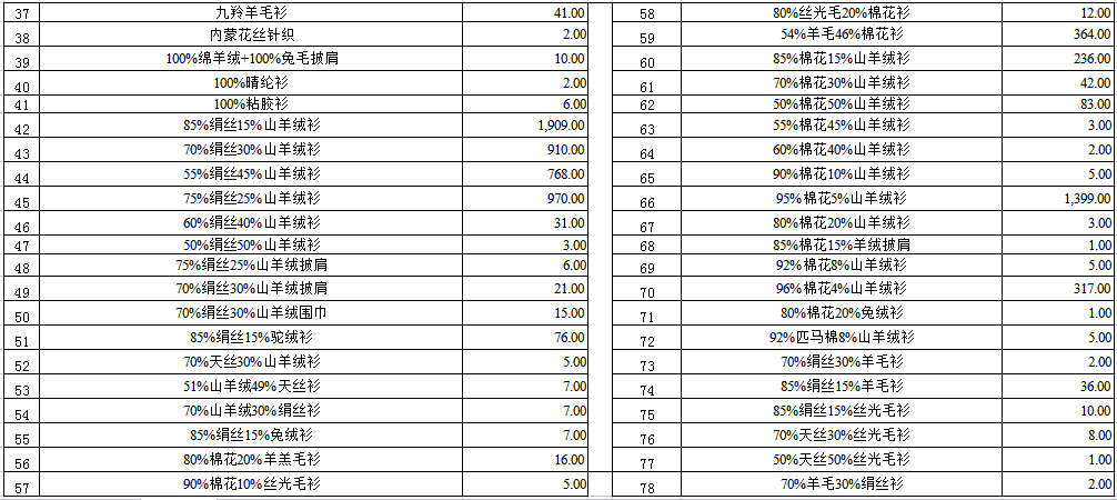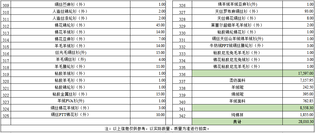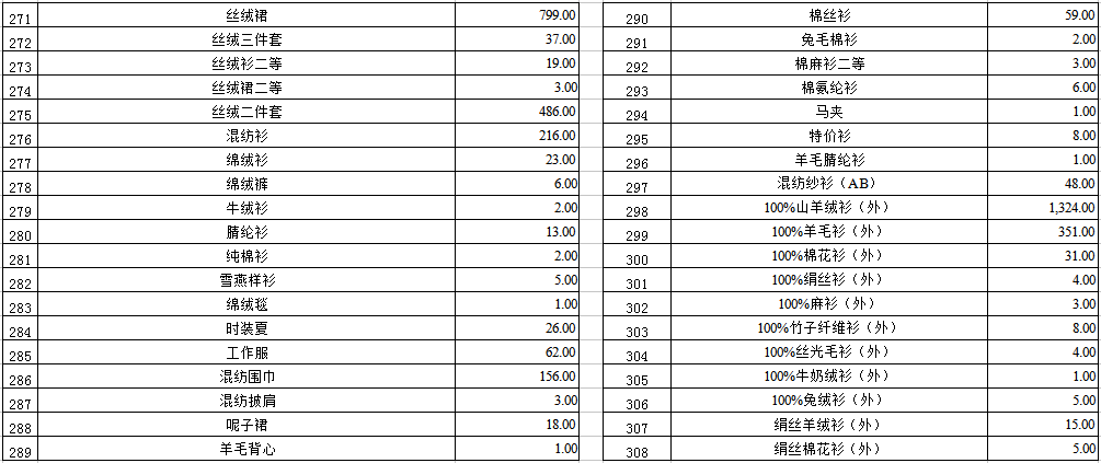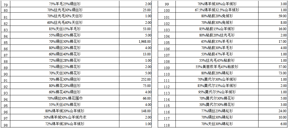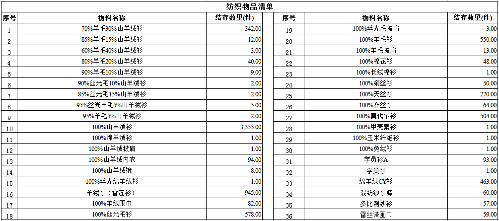 - 紡織物品一宗(羊絨衫、莫代爾衫、棉花衫、混紡面料等)。
