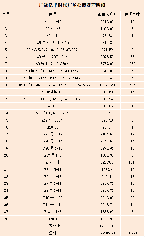 基本情況:該抵債資產位于東營市廣饒縣廣饒濰高路888號億豐國際時代廣場,廣饒老汽車站西鄰。總建筑面積66495.71㎡,房間1558套,經法院裁定抵債,未辦理過戶手續。