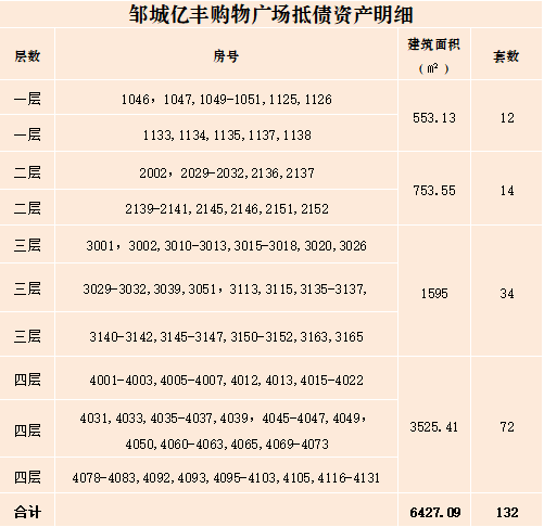 基本情況:該抵債資產位于鄒城市平陽西路499號??偨ㄖ娣e6427.09㎡,房間132套,包括一層12套,二層14套,三層34套,四層72套,經法院裁定抵債,未辦理過戶手續。